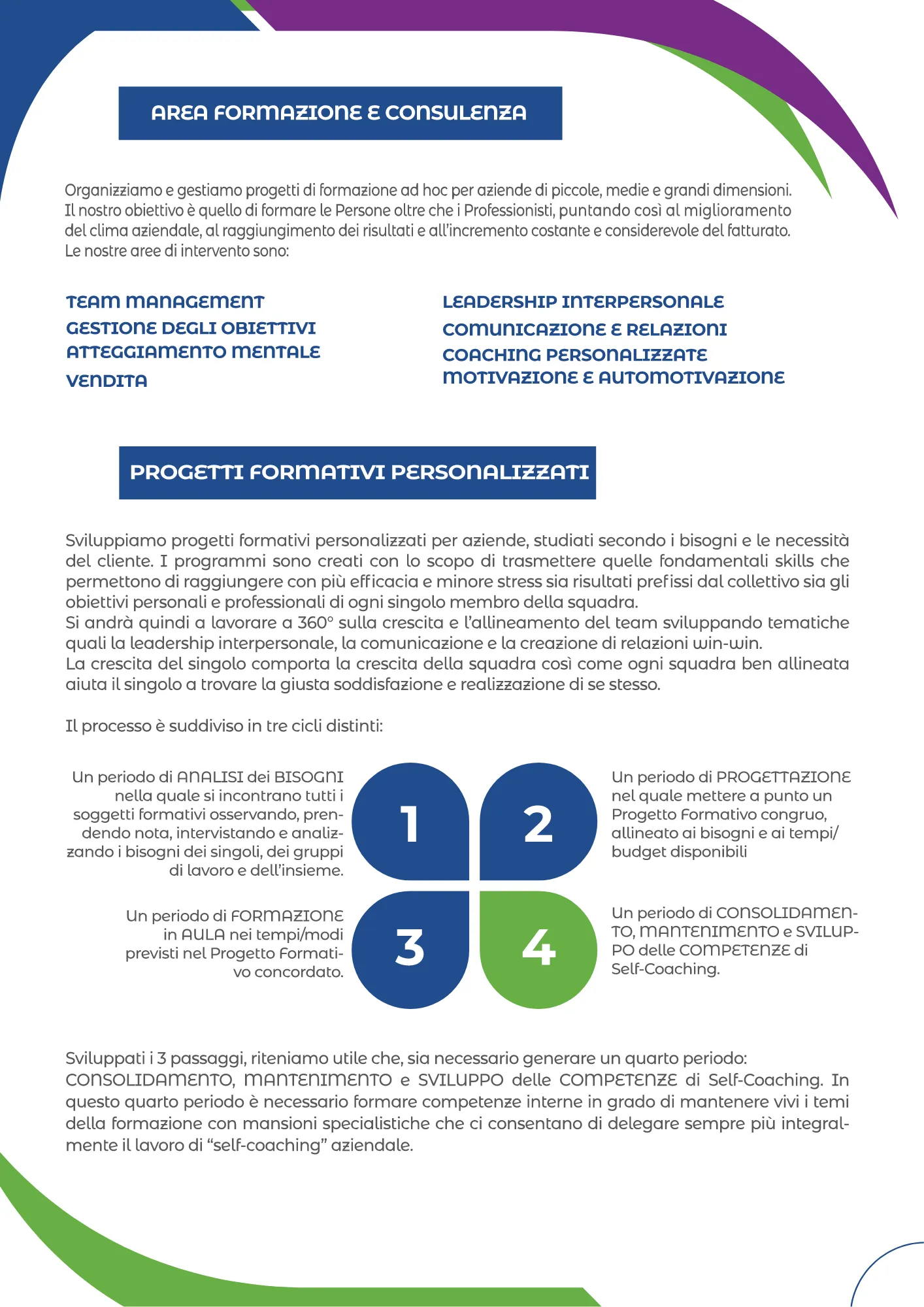 Il nostro obiettivo è quello di formare le Persone oltre che i Professionisti, puntando così al miglioramento del clima aziendale, al raggiungimento dei risultati e all'incremento costante e considerevole del fatturato.